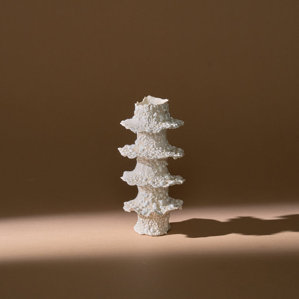 Her work resists the purely utilitarian, existing instead in the quiet space between control and release. No two are alike—each piece shaped by gesture, gravity, and a deep respect for the material. Sculptural yet practical, these candle stands and vessels are meant to be lived with, admired, and used.