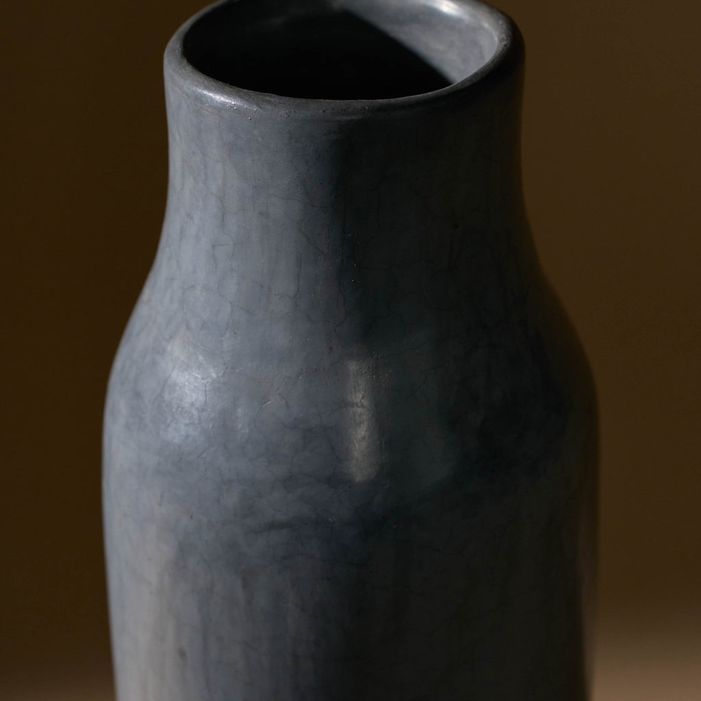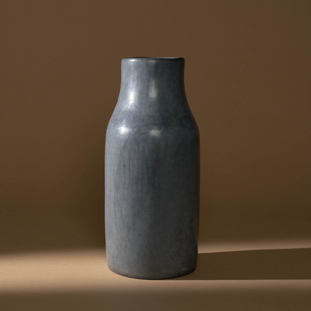 Crafted by hand using traditional tadelakt techniques, this large vase features a tall, graceful silhouette and a moody blue-grey finish with subtle marbling throughout. Its smooth, stone-like texture and sculptural scale make it an elegant piece for any interior setting.