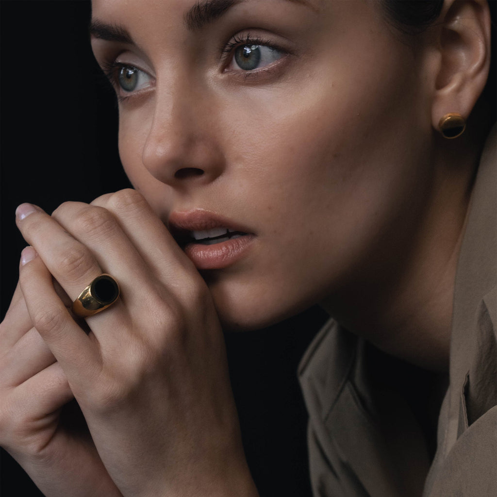 A classic shape crafted from upcycled brass and plated in 18K gold or silver, these earrings feature a sleek inset of repurposed horn.