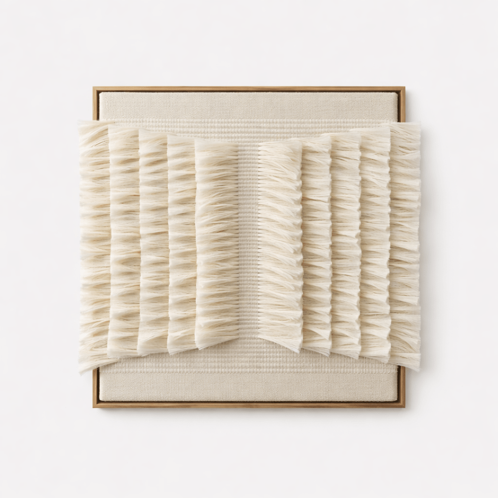 Handwoven in Mexico, this sculptural textile artwork layers sansevieria, henequen, and cotton across a wooden frame in a bold, architectural composition. Vertical bands of densely hand-finished fringe create striking rhythm and depth, offering a refined interplay of texture, structure, and soft movement.