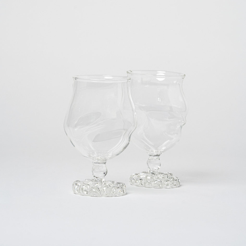 Sensual, sculptural, and grounded in form, these hand-blown glasses echo soft curves and organic silhouettes. Each glass rests on a fluid, textured base that feels both delicate and architectural.