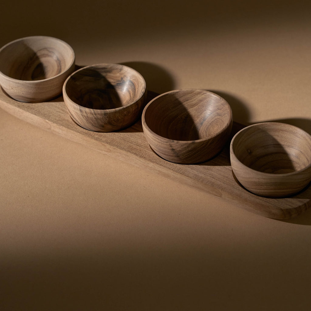 Crafted by hand in Morocco, this walnut wood mezze set includes four rounded bowls nestled on a slim serving paddle. Ideal for dips, olives, or spices—each piece brings natural warmth and refined simplicity to the table.
