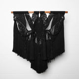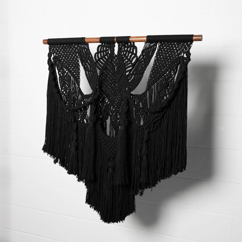 This black wall hanging has an angled design and precise, woven knots that create a pleasing pattern.