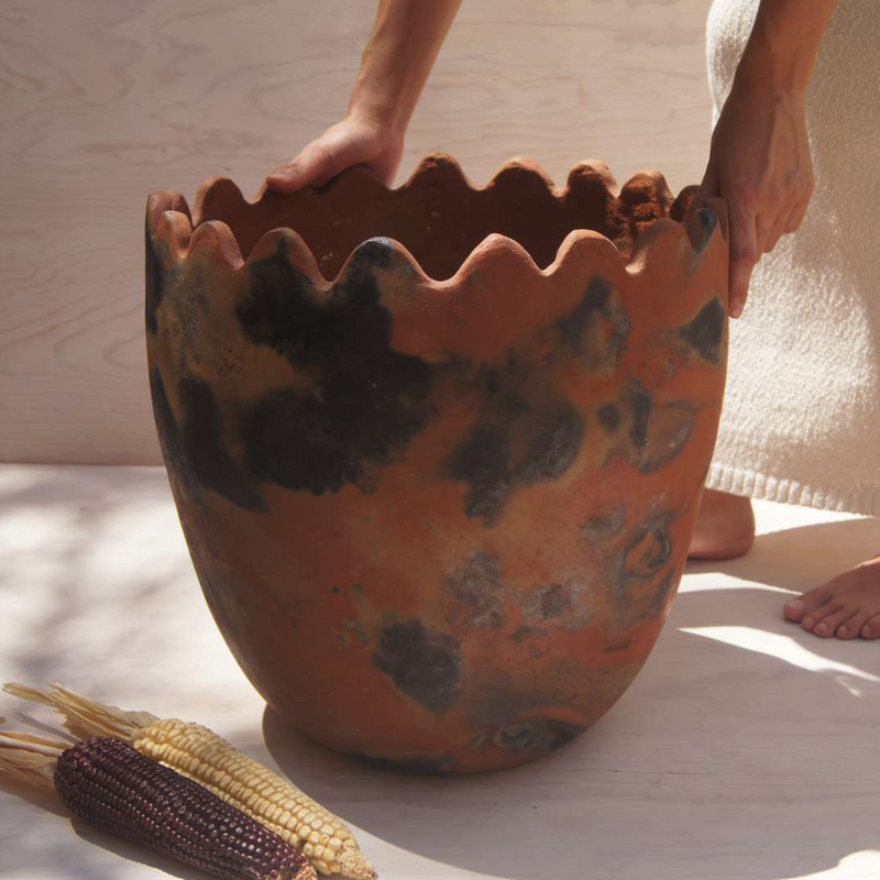 Cocucho’s artisans are known for their monumental ollas cocuchas—towering vessels that once held water and grain, now revered as sculptural works of art. Each is built entirely by hand without a wheel, smoothed with river stones and a corn cob, and fired outdoors in open flame.