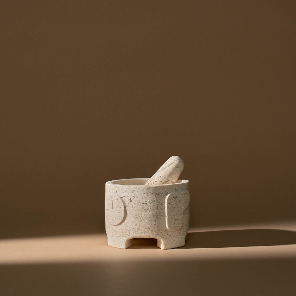 This hand-carved marble mortar and pestle is a stunning, contemporary piece.