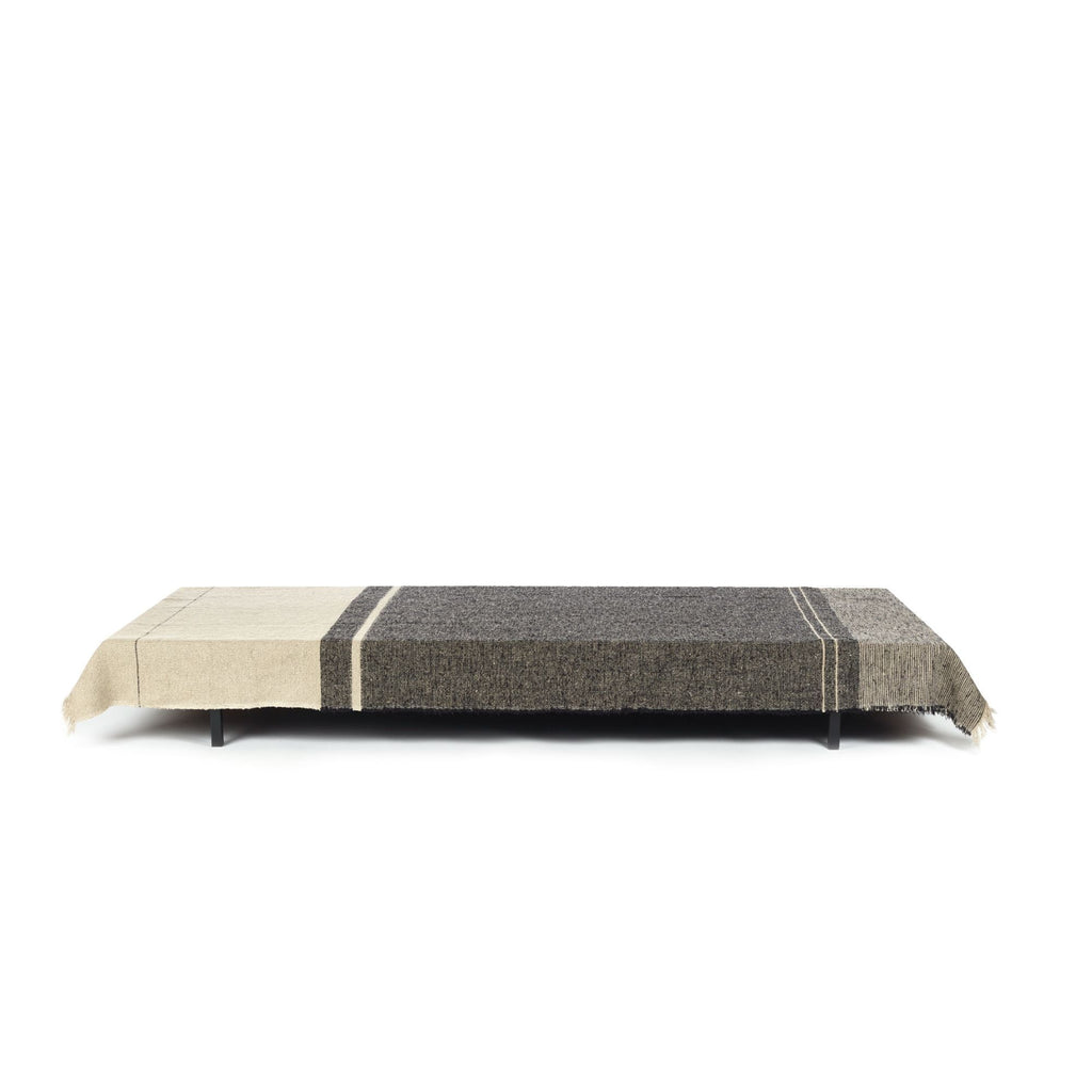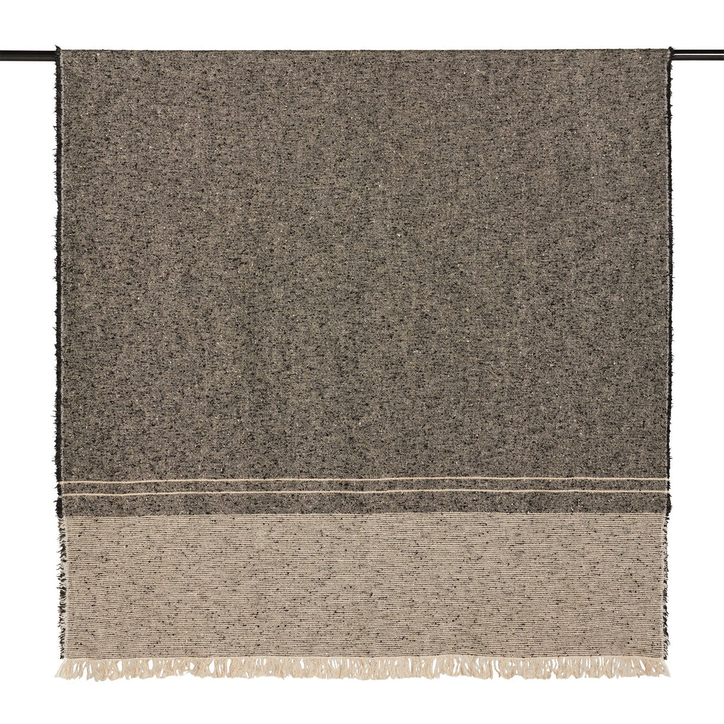 A linen-blend blanket with a luxurious feel in shades of natural flax and soft black.