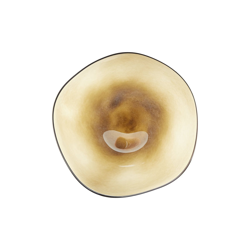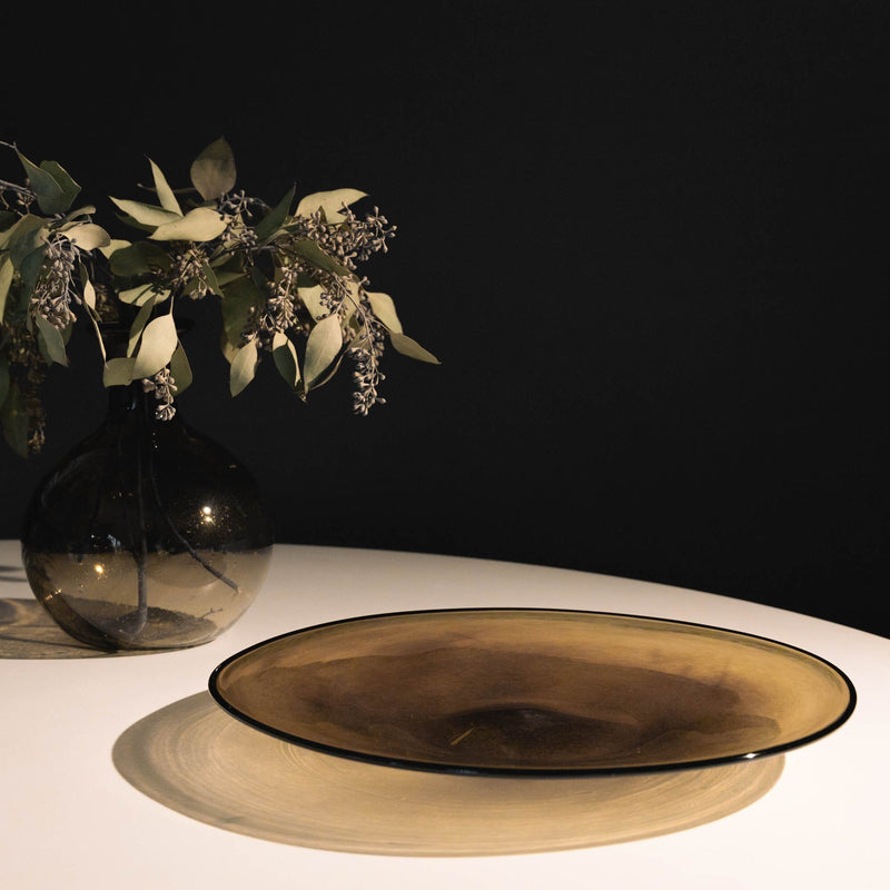 Inspired by the slow movements of fog in Osaka, these artisan-made plates are truly hypnotic. A fluid, organic shape is highlighted by the semi-transparent glass and a dark, outlined edge.
